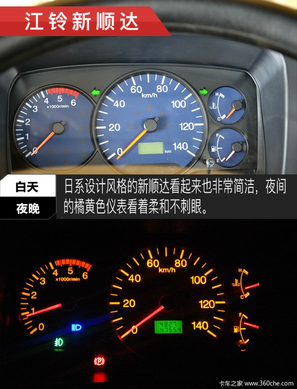 新顺达和凯锐800仪表盘布局几乎都是一样的,整体设计风格来源于经典日系。而新顺达和凯锐不同的就是仪表台颜色,还有就是白天整体看起来不如凯锐800精致。夜间新顺达橘黄色的夜间仪盘看起来也是很柔和的。