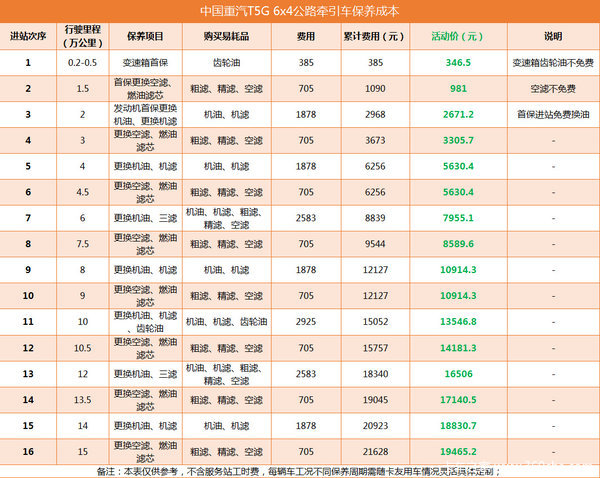 由于T5G车型的主销为载货车及牵引车,小编分别做了T5G 6x2双前桥载货车及6x4牵引车保养费用的参考表,其中如果这辆T5G 6x4公路牵引采用的是曼技术后桥,正常行驶到15万公里时,保养费用为21628元左右,集鑫服务站保养打折活动期间则为19619.2元,按原价计算,每1万行驶里程花掉的保养费为1802.33元,一公里1毛8左右。