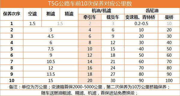 相比T7H,T5G公路车的三大总成保养周期规律更明显,空滤、燃油滤更换里程为1.5万公里,机油更换里程为牵引车2万公里、载货车3万公里,而齿轮油T5G和T7H保持一致,变速箱在2000-5000公里首保后,保养周期为10万公里,后桥保养周期也为10万公里,其中曼桥首保10万公里、青特车桥首保同变速箱保持一致为2000-5000公里。