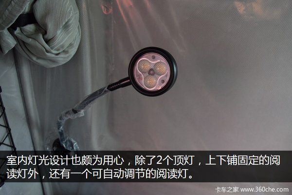 卧铺的阅读灯对于司机在夜间阅读或者车内活动至关重要,有的车型上除了有2个顶灯,上下铺固定的阅读灯外,还有一个可自动调节的阅读灯,更加的方便自如。
