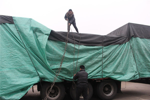 由于当天的货不够三个车装,项师傅就让堂弟先装满后出发,自己等明天再继续装。货装了一半,为了防止货物被雨水淋湿了,现在需要先盖篷布,第二天还得卸下来等装完货后再盖一次。盖篷布是平板挂车司机经常需要干的一件事,这活一个人很难干,而现在雇一个副班司机的成本已经到了每月1万元的水平,散户司机很难支撑,专门雇个帮工也不合适,这也是催生夫妻车大量出现的一个原因。除此之外,在服务区守夜,在路上做饭,以及找货源也是卡嫂们的主要工作。