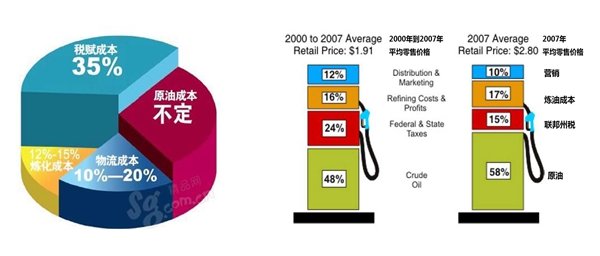 在我国,油要比美国贵40%以上。我们油费之所以高,根本是因为油价里暗含了很多税钱。中国油价税收占35%左右,包括有增值税14.5%,消费税18.5%,其他税3.2%,美国油价税收长久以来比较稳定,平均只占15%左右。
