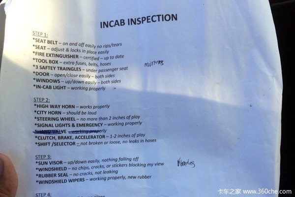 4、排挡挂入一档,熄火,放掉所有气刹(车头与挂车的),我将踩住我刹车踏板一分钟,我的气压不能失去4PSI,3个给我车头,1个给我挂车;