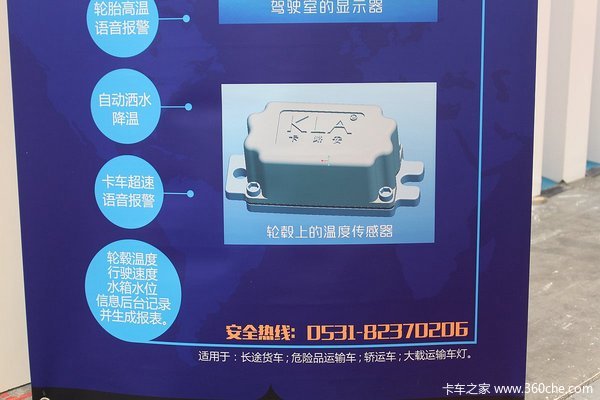 来卡车之家App【卡车之家 原创】在2016亚洲生鲜配送展上,物流小秘联合卡路安推出了一款卡车防火系统,据介绍这套系统通过监测轮毂温度、水箱水位、轮胎胎压等一系列参数,并且在系统中预设报警数值,在达到报警限值时自动报警提示驾驶员和车主,防止发生事故。