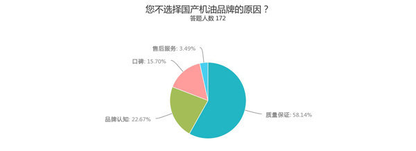 在不选择国产机油品牌的调查中,有近六成的卡友选择的是质量,其次是品牌认知度以及用户口碑。很明显质量保证才是卡友最为关注的,其实随着技术日益进步,大牌机油间的差异逐渐缩小,只要能选购到正品还是可以放心使用的。