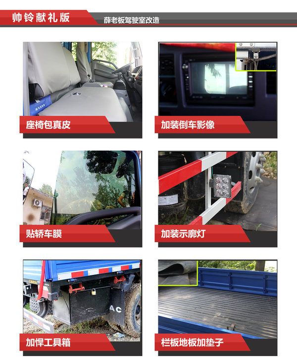 好马配好鞍,买来了好车,也要自己好好捯饬捯饬,才能让爱车更美更好。帅铃献礼版驾驶室依旧主打实用性和舒适性,自带电动门窗、中控锁和原厂空调,薛老板在这基础上做了些改动,所有的窗户都贴上了轿车用的反光膜、加装了倒车影像,并为座椅包起了真皮椅套,这么捯饬完全就一个乘用车驾驶室配置嘛。