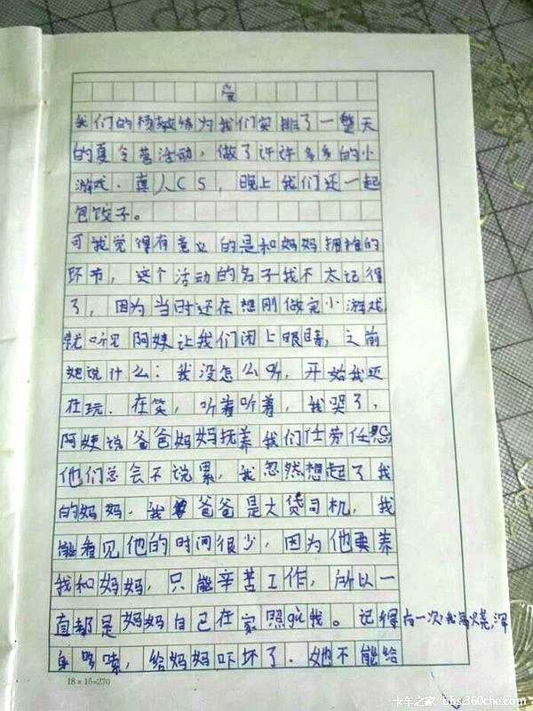 短短的300百来字的作文,字里行间没有太多华丽的词汇,纵然字迹并不整齐,有错别字也有涂改的痕迹,这种不夹杂太多修饰的爱才是最真实的!卡友们在此刻是否想起子女写过的类似话语?