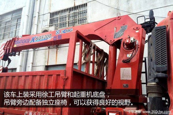 该车上装采用徐工吊臂和起重机底盘,吊臂旁边配备独立座椅,在为高空作业提供良好视野的同时,也确保了周围人员的安全。据司机介绍,该吊臂最大吊载重量为8吨,完全满足车站、港口、仓库、建筑工地等狭窄场地吊运需求。