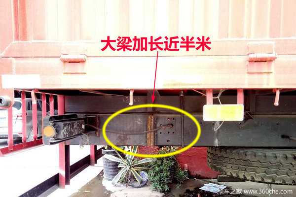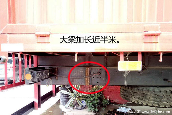 该车仔细看去要比普通车长一点,原来是车主将大梁加长了半米,大梁上有明显的焊痕。然而像这种私自加长大梁的现象很常见,笔者就在随吊车附近发现了好几辆。加长货箱,就能多载货,节省运输成本,为了应对竞争激烈的市场,司机也只能用此无奈之策。但是,卡友们要冷静对待货车加长现象,最好不要私自改装,不然被逮住了又是记分又是罚款,很麻烦。