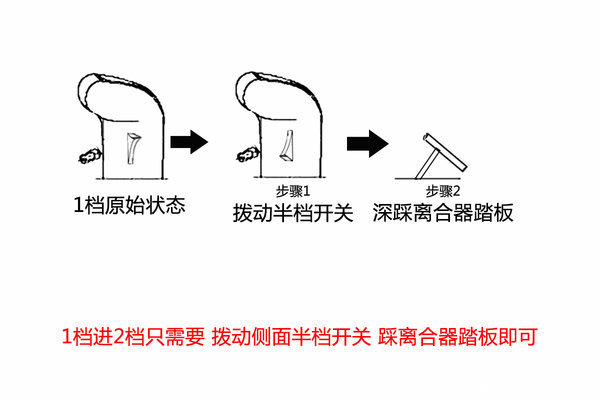 1档进2档:车辆在起步阶段,高低挡开关和半挡开关都处于下面的位置,此刻变速箱挡位为1挡。1档进2档,仅需拨动侧面半档开关(往上部),踩离合即可完成档位切换。