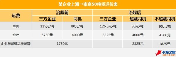 在治超之前,跑一趟车三方企业的收到的运费是115元/吨x50吨=5750元,司机得到的运费为80元/吨x50吨=4000元。对于企业而言,除去7%的税和司机收入,就是利润了。