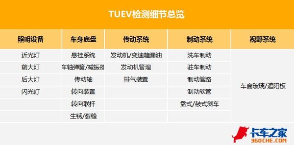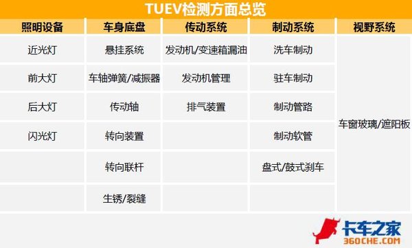 此处所提的故障率,TUEV协会也制定了专业的检测标准,他们考虑了一辆完整的卡车最重要的故障发生形式,分为照明设备、车身底盘、传动系统、制动系统和视野系统五大方面,大方向下又将进行更为细致的检测。具体检测方面如上表。