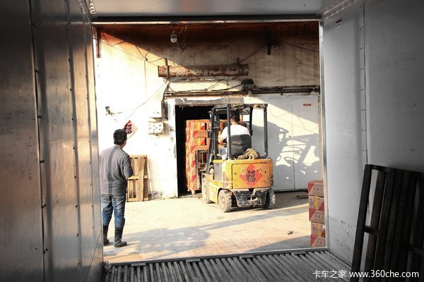 叉车将鸡肉放在挂车尾部,托盘下带有铁轱辘,通过人推的方式将鸡肉推到挂车里面,一个托盘的鸡肉很重,需要两个人才能推动。虽热冷藏车辆不需要封车,但是需要进行货物清点,如果不仔细清点货物,卸货的时候发生数量缺少只能车主进行赔付。