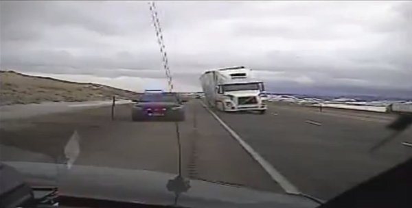 2017年2月11日报道,美国怀俄明州一辆货车日前在高速公路行驶时,突然一阵强风吹来,整辆货车翻侧压毁一警车。幸好警车当时没有人,才未酿成死伤。