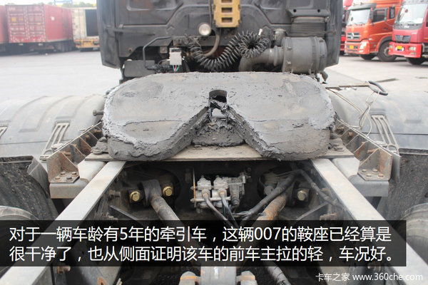 我们来看看鞍座,对于一辆车龄有5年的牵引车,这辆007的鞍座已经算是很干净了,也从侧面证明该车的前车主拉的轻。