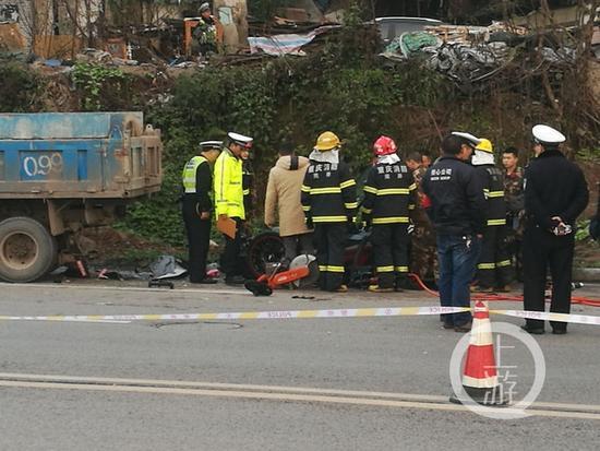 下午6点30分上游新闻-重庆晨报记者赶到现场时,交巡警、消防部门人员已赶到现场。现场只剩下出事的豪车和货车。