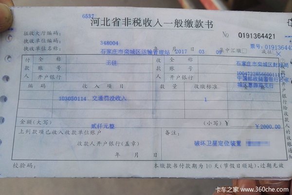 罚款单上写的也比较明白,破坏卫星定位装置,也就是我们常说的北斗。卡友介绍是因为车辆因为某些原因换过驾驶室总成后,还没来得急装上北斗就上路运营,后来被检查到没有安装定位装置而被开出罚单。