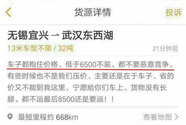 为了养家糊口,为了新车的车贷,运价再低都要硬着头皮上,因为运输市场上流传着这么一句话“你不拉,总会有人来”。