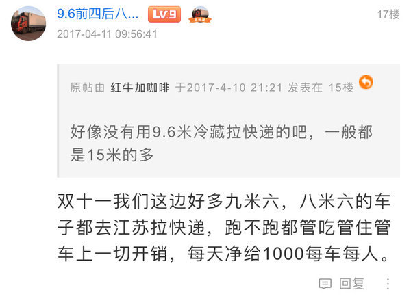 不过这样也挤压了一些普货运输车的生存空间,尤其是拉快递的9.6米厢货车。一来半挂冷藏厢容积大,比9.6米厢货更有优势,二来这些冷藏车是回程车,运费要得低,就连一些专拉快递的半挂车也给比下去了。