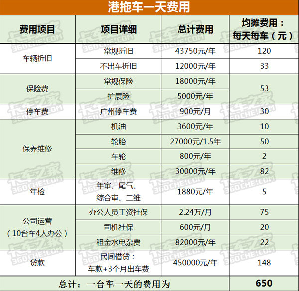 来卡车之家App【卡车之家 原创】我印象中港口集装箱运输利润低,猜测用车成本应该也不会高,不过近期广州某港拖车队的老板准备购车,就给我算了一笔账,他将车队里每台车的具体费用均摊到每一天,我一看,还真不算少。