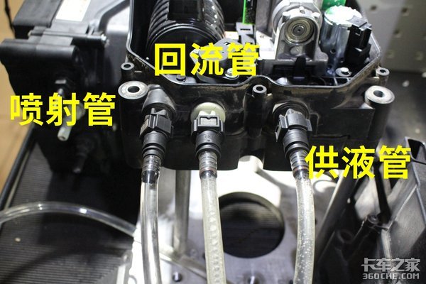 尿素泵外侧有三个尿素溶液管路,左边的是喷液管,中间的是回液管,右边的为进液管。