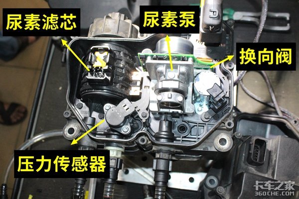 尿素滤芯下端的是压力传感器,用于检测尿素泵的压力,为SCR电控单元提供压力信号,保证尿素的喷射正常。