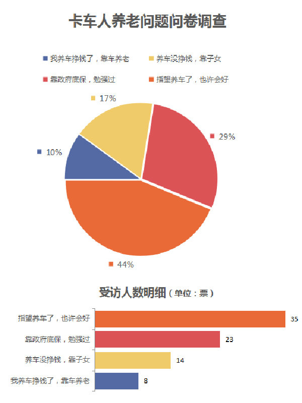 剩下47%的司机对运营车辆来养老不报希望,18%的司机认为车子挣了钱,只能靠子女解决养老问题,甚至有29%的司机觉的谁也靠不上,只有靠政府的低保来养老。
