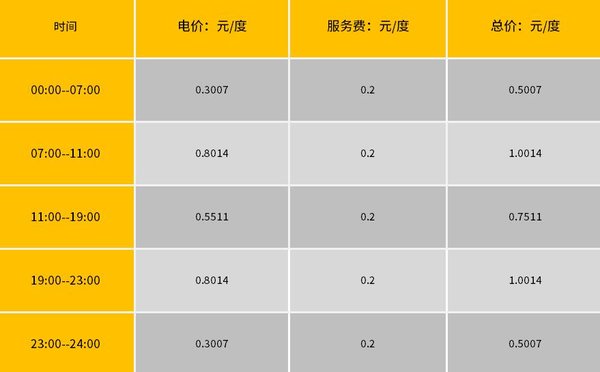 我们可以看到该公司将电价按充电时间分为几个不同阶段,最便宜的是在当日的23点之后至明早7点钟,每度电只需0.5007元。但在上午的7点--11点,和19点--23点是用电高峰期,所以电价较贵,达到了1.0014元/度。11点--19点,电价出于最高和最低的中间,0.7511/度。(据工作人员介绍,后期价格可能会有变动)