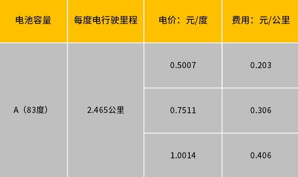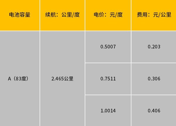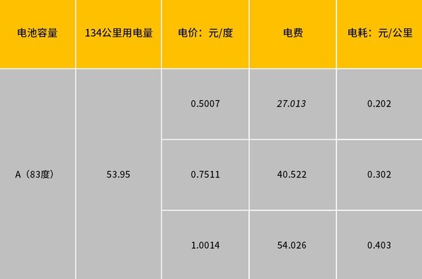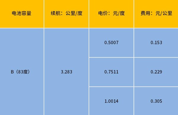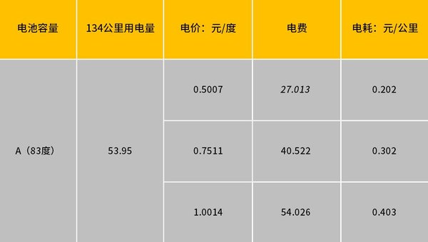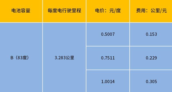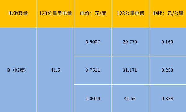 B车我们同样抽取一组数据,以跑了123公里,用了50%电量,电池组容量83度为例。可得出可得出该车跑123公里,用了41.5度电,根据不同电价我们也可算出表上价格。以电价为1元的时候计算,每公里费用约为0.34元。