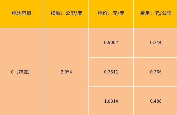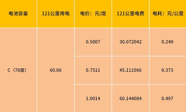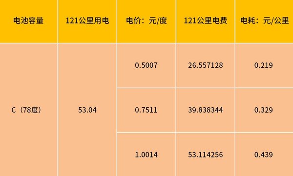 以电池容量为78度的C车为例,跑了121公里,耗电量68%,用电量为53.04度。同时根据不同时间段电量我们可算出相应价格。以电价为1元的时候计算,每公里费用约为0.44元。