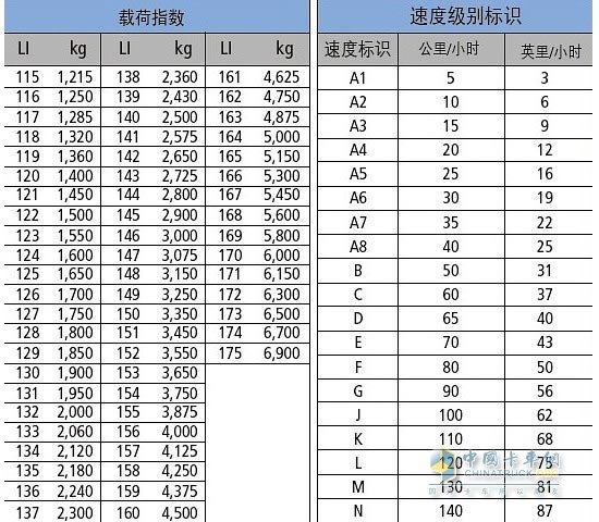 有时间的卡友老铁,下车后可以看一下你的轮胎上所表达的这些息,学会认识自己的轮胎,看看你的轮胎宽度、匹配的轮辋直径、负荷指数、速度记号是多大,下面我会给你一张对照表,标准情况下,你的轮胎负荷指数是多大,也就是说你的车最多能拉多少,你的轮胎速度记号是多少,也就是说,你的轮胎可承受的最高车速是多高。