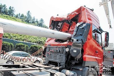 所幸的是当时司机驾驶的车辆正在爬坡中,车速每小时不超30公里。假设当时车速七八十公里的话,恐怕就不单是将驾驶室挤压变形那么简单了,直接“戳”穿,把驾驶员“串糖葫芦”都不无可能。