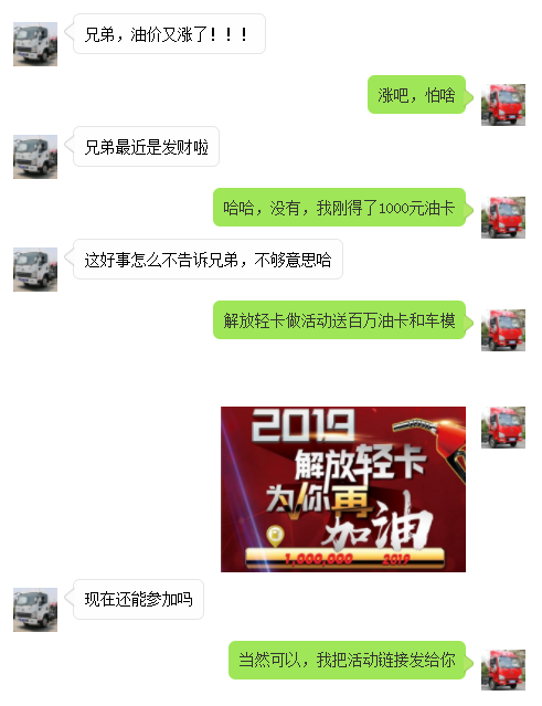 本次“2019解放为你再加油”活动共准备100万元油卡馈赠买车用户,还准备了解放轻卡车模、蓝牙耳机、充电宝等幸运小礼物,抽中直接寄给你!