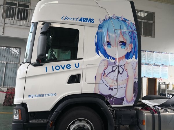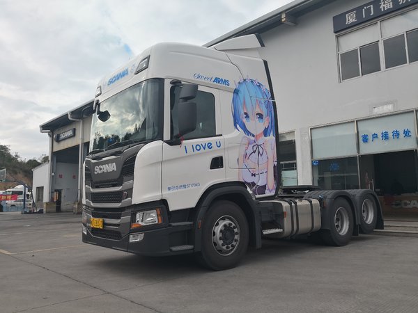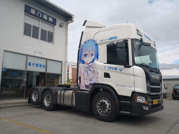 【卡车之家 原创】5月5日,厦门一位卡友在微信群内分享了几张斯堪尼亚牵引车的照片。与众不同的是,这辆车上贴有二次元角色“蕾姆”的图像。据这位卡友介绍,完成这次改装光材料费就要2000元,此外还要加上人工贴图的费用,投入也是不小。