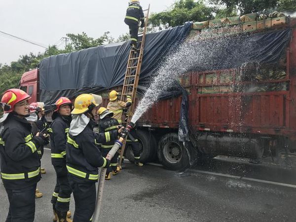 事故发生后,湖州开发区消防救援大队迅速派员赶往现场进行救援。消防员到达火灾现场时,货车尾部仍有明火在燃烧,大量浓烟不断冒出,被烧的香蕉却发出一阵阵的香味。消防员一边用水枪进行灭火,一边利用单杠梯爬上车厢,对堆积的香蕉进行清理。大约90分钟后,明火被扑灭,但货车尾部的几百箱香蕉已经被烤熟。