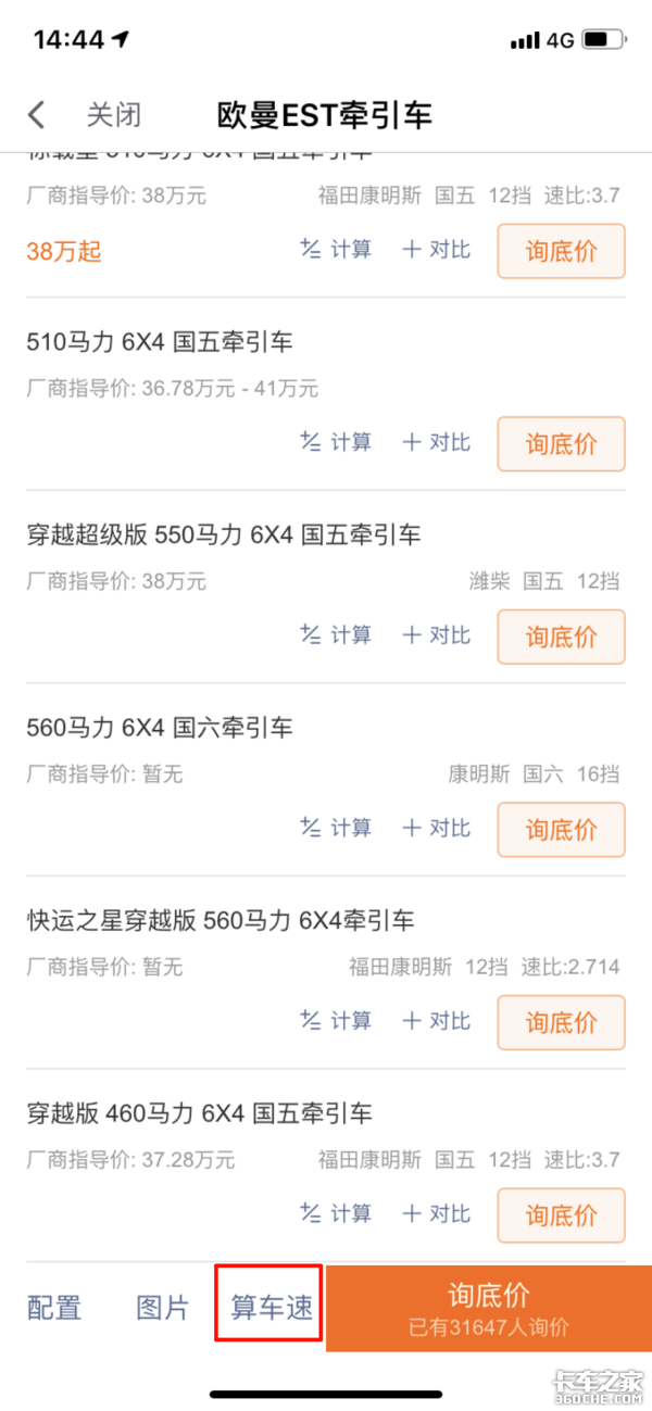 第二步:进入到某一品牌车系后,上滑屏幕,屏幕下方会出现“配置 图片 算车速 询底价”菜单栏,然后点击算车速,选择你想使用的专业版/简易版车速计算器。此处需要注意的是,上滑屏幕时间需要久一点。