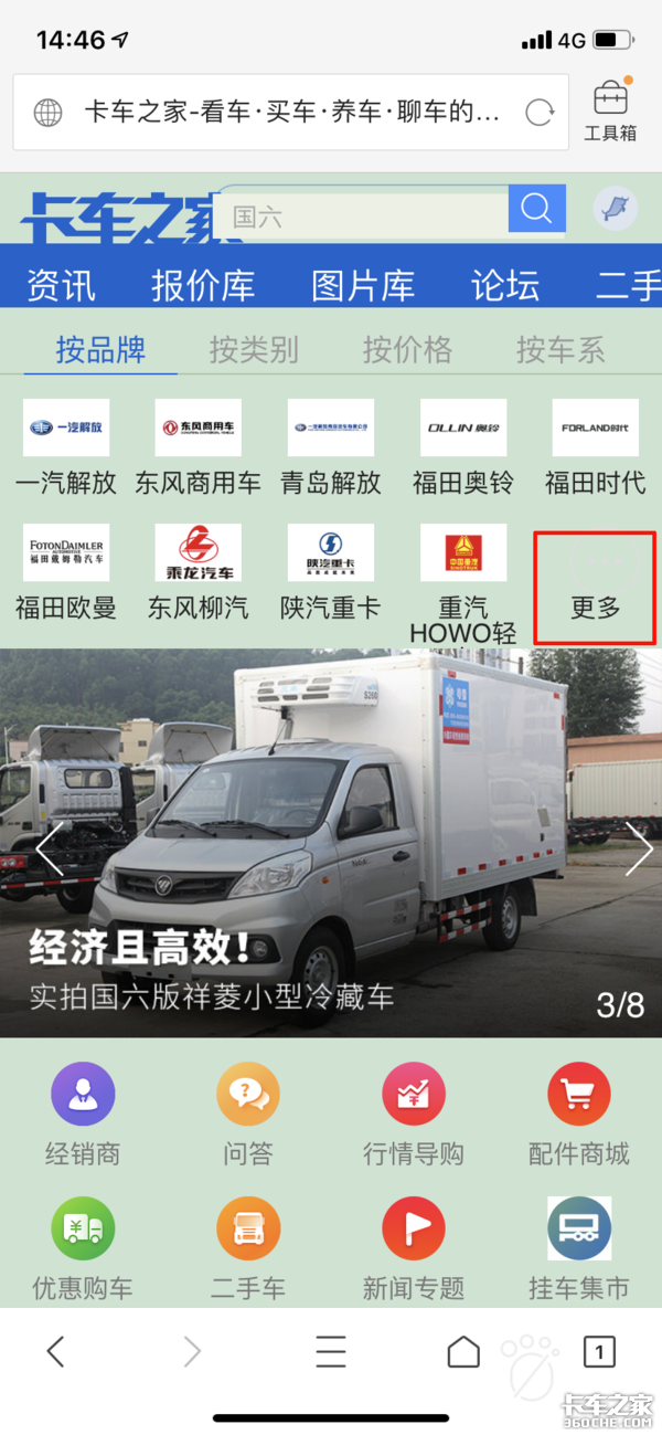 第一步:手机浏览器搜索打开卡车之家网站首页,点击页面中的“更多”,并在弹出页面找到你想计算车速的品牌车系。