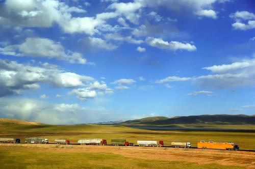 青藏公路上行驶的大型卡车一辆接着一辆,一派繁忙景象