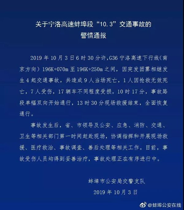 事故共造成9人当场死亡,1人因抢救无效死亡,7人受伤,17辆车不同程度受损。