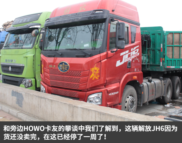 后来我们也见到了这辆JH6卡友本人,和车主攀谈,卡友是山东人,主要往返广州——北京——云南等地。这次他从广州拉的一车青椒到北京已经5天了,车上的货还没卖完,多等一天吃饭住宿都得花钱,还不知道货主怎么补偿,说得卡友自己欲哭无泪。