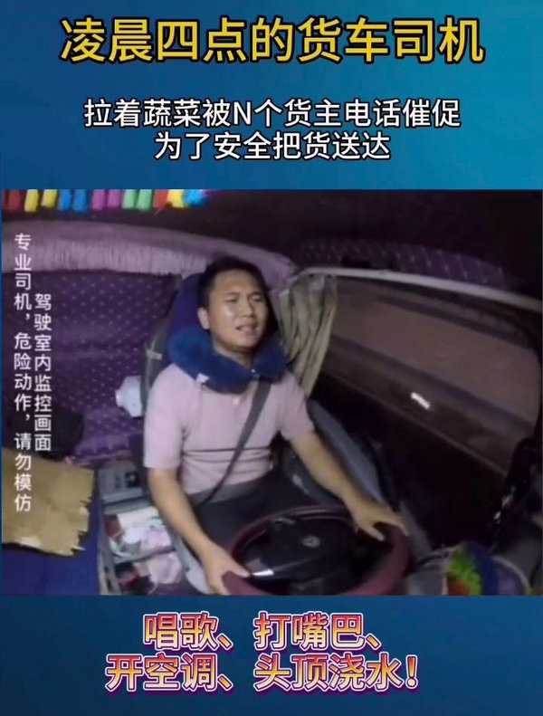 货主不断电话催促,为了能及时安全把货送达,这位卡车司机只有在凌晨出车,不断的通过大声唱歌、打嘴巴、开冷气等等行为,来缓解自己的疲劳,让自己保持清醒。如果不是为了生活,谁会这样?