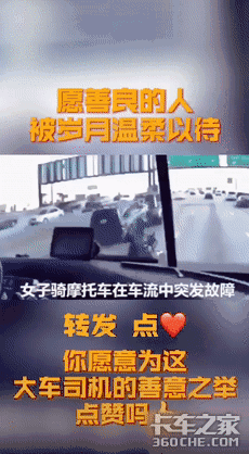 对于那些横穿马路的行人,大货车司机会猛按喇叭鸣笛提醒行人注意。那么对于车流中央遭遇突发故障的摩托车,大货车司机又会怎么操作呢?他们居然用自己的车身挡住车流护送对方到达安全地带。