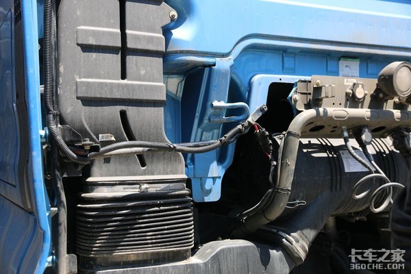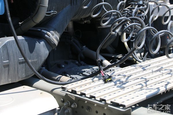 由于在检修发动机的时候需要将驾驶室掀起,所以从空调到电瓶的线也不能一根线直连,而是一分为二,两条线分别连接空调和点评,之后在驾驶室后方通过一个接口连接。实际我们体验了一下,在掀起驾驶室时,这个接口可以直接被拉开,线材不会受到损坏。不过个人感觉,为了提高使用寿命,在举升驾驶室之前还是尽量先把这个接口打开。