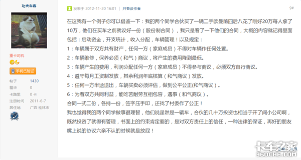 此前就有卡友跟我吐槽,自己的合伙人什么事都不管,除了买车的时候“闪现”了一下,上牌上户、后期谈固定货源、找散货,都是自己干的,但是一到分成的时候要求五五分,还怀疑这位卡友“中饱私囊”,这位卡友非常生气但也很无奈。