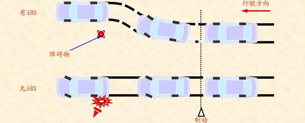 而有ABS的的情况下,紧急制动车轮和地面之间是滚动摩擦,车轮与地面之间没有变成静摩擦。这时候转动方向盘,是可以改变车辆行进的方向的,简单的说,有ABS的情况下,你踩下刹车,你打方向是有用的。没有ABS,你紧急制动车轮抱死,车辆会跑偏,打方向是没有用的。