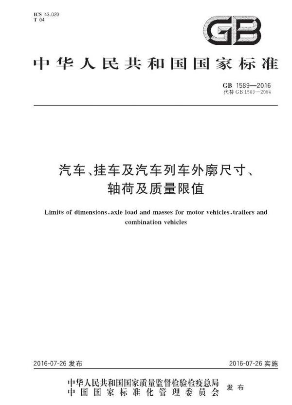 本标准代替GB 1589-2004《道路车辆外廓尺寸、轴荷及质量限值》。与GB 1589-2004相比,除编辑性的修改外主要技术变化如下: