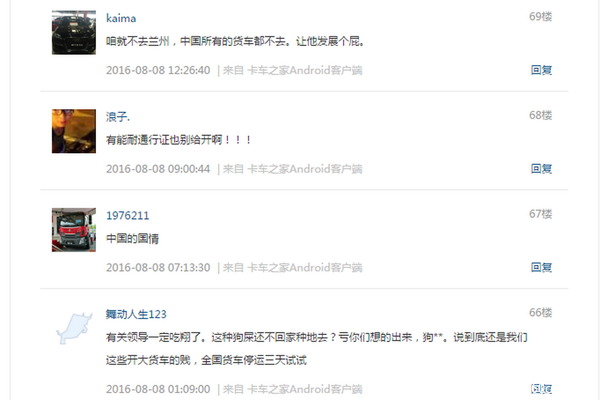 在兰州禁行政策颁布后几天之内,卡友们很快知道了这个消息,消息被纷纷转发。很多经常跑兰州的卡车司机都暂时放下兰州的货源,转而倒短或者去跑其他地方,去兰州送货的车越来越少,货物供应量也逐渐减少;再加网络上吐槽声不断,相关部门也注意到这个情况。