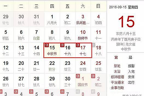今年中秋假期安排在9月15到9月17日,共三天,9月18号(周日)正常上班。有假期的卡友可以趁着这个小长假好好休息一下,和家人聚聚。当然如果有出行安排的话,也很方便,今年中秋规定在15日至18日期间,道路不限尾号。