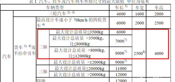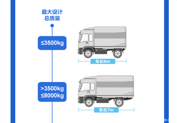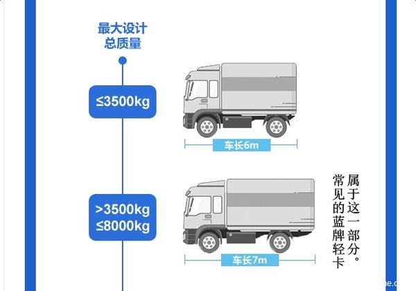 很多在看到这张图或者是相关报道时,可能会把第一条看成6米以下的车设计总重只能在3.5吨以下。其实正确的理解是这样的,最大设计总质量在3.5吨或以下的车,总长不能超过6米。现在常见的4.495吨的蓝牌车,属于图中第二条,即总长不能超过7米(小于7米是允许的),蓝牌轻卡的5.995米自然也在这个范围内。