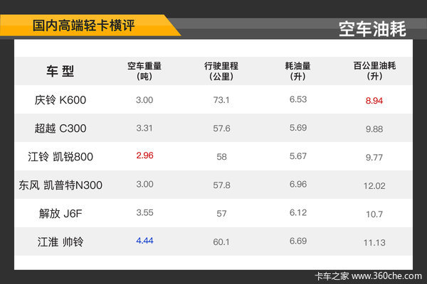 今年初卡车之家广州站做了6款轻卡横评,这是当时测得的车辆净重(其中江淮是用户特别定制的车厢,对坚固性要求高,所以比较重)